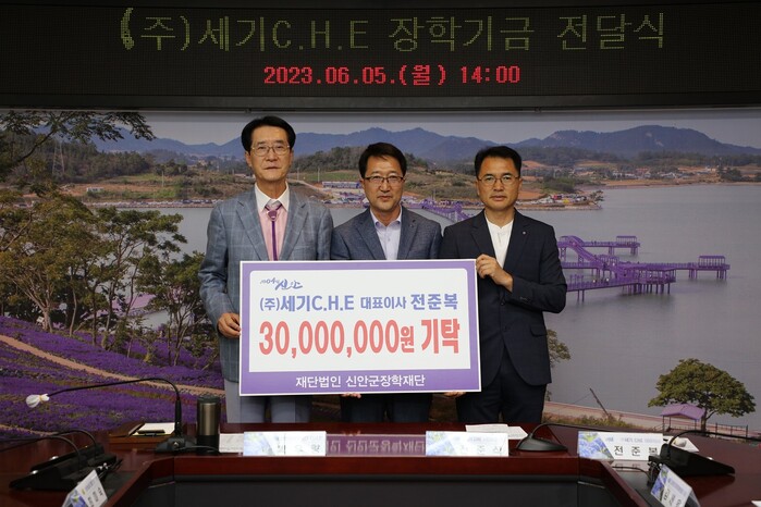 [신안=황승순 기자]㈜세기C.H.E 전준복 대표와 전준석 CEO는 5일 신안군장학재단(이사장 박우량)에 지역사회의 어려운 학생들을 위해 사용해 달라며 장학기금 3천만 원을 전달했다.