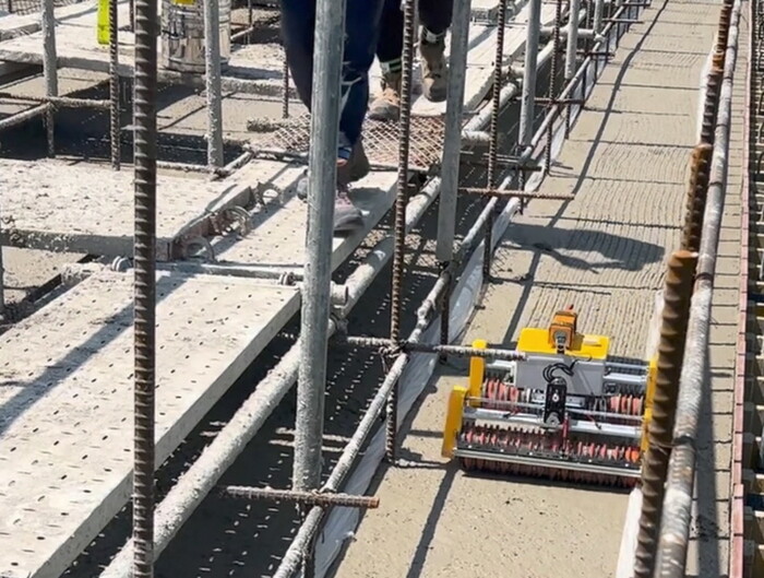 포스코이앤씨가 개발한 요철생성 로봇은 아직 단단히 굳지 않은 콘크리트 표면에 요철을 생성할 수 있는 특수바퀴를 탑재한 소형 주행 로봇으로 사람이 직접하는 것보다 작업속도가 현저히 빠르고 요철작업으로 발생되는 콘크리트 부산물을 최소화할 수 있으며 균일한 요철을 만들 수 있다는 이점이 있다.