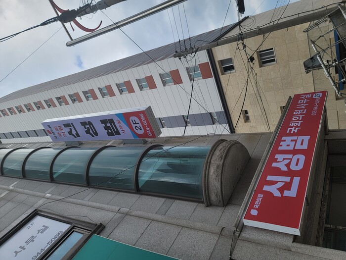 건물 외벽에는 국민의힘 상징색인 빨간색을 주 디자인으로 입체형 돌출간판을 세우고, 전면 유리에는 선명한 고딕체로 이름을 새겨 멀리서도 한 눈에 들어오게끔 생동감을 불어넣었다.