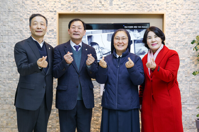 | ▲ 안산시의회 의원들이 설명절을 앞둔 지난 10일과 11일 지역 사회복지시설 5곳을 위문차 방문했다. 사진은 11일 박태순 의장과 한명훈 기획행정위원장, 김유숙 기획행정부위원장이 안산빈센트의원을 방문한 모습 /사진제공=안산시의회 |