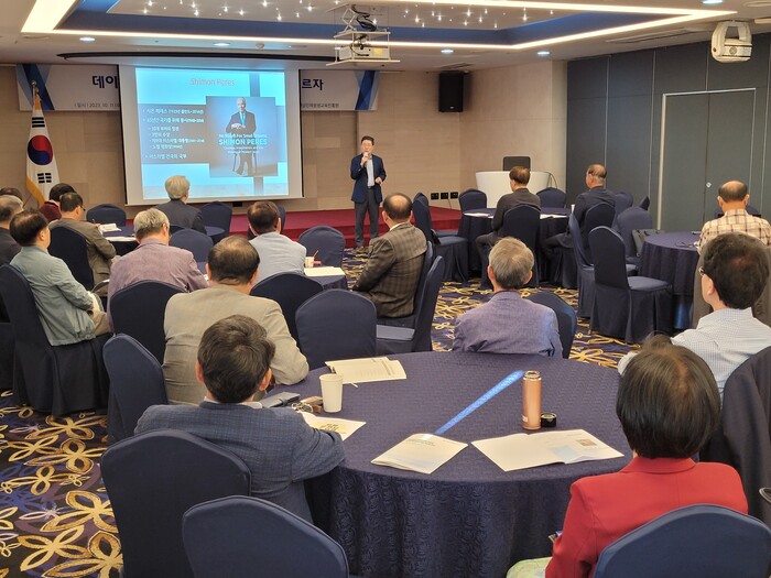 | ▲ 11일 오전 목포소재 샹그리아 호텔 8층 대회의실에서 윤교수는 목포시민과 회원들이 참석한 가운데 상상을 현실로 실현하는 미래 시대를 여는 데이터 대 항해시대 소프트파워를 키우자!는 주제로 강연을 했다.(사진=황승순 기자) |