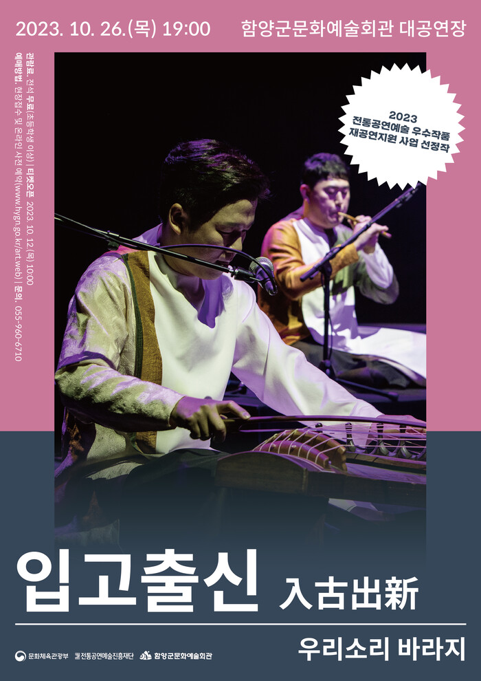 ‘입고출신(入古出新)’은 함양군에서 지난 2월 전통공연예술 우수작품 재공연 지원 사업으로 선정된 작품으로 아쟁, 타악, 대금, 소리, 피리, 가야금 등 전통악기로 구성된 음악집단 ‘우리소리 바라지’가 민속 및 무속음악을 동시대적인 음악으로 재탄생시킨 작품이다.