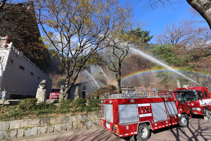 이번 훈련은 통도사 경내 화재발생을 가정하여 초기 화재진압 및 문화재 보호 반출 등 자위소방대 초기 대응능력 향상에 집중하여 소방서와 통도사 관계자 30여명이 참여한 가운데 합동 소방훈련을 실시하였다.