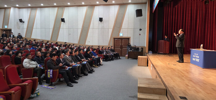 | ▲ 이개호 국회의원이 목포시민들을 살대로 광주전남 행정 통합 관련 설명회 자리에 함평 아상익 군수, 목포 발홍률 (전)시장 등이 참석했다. |