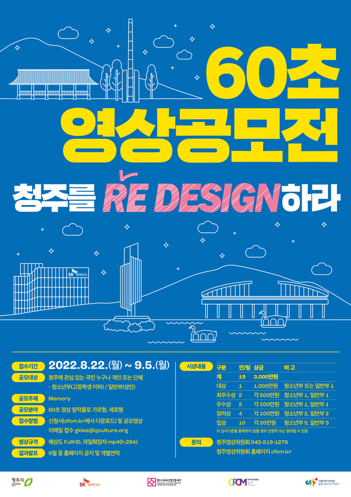 청주시와 SK하이닉스가 공동 주최하고 청주시문화산업진흥재단과 청주영상위, 충북시청자미디어센터가 공동 주관하는 이번 공모전은 역사와 문화는 물론 첨단기술까지 갖춘 도시 ‘청주’를 짧은 영상에 담아 알리기 위해 기획한 것으로, 2회째를 맞은 올해의 주제는 [메모리Memory]이다.