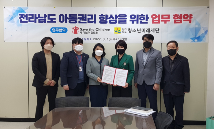 (재)전라남도청소년미래재단(원장 양미란)과 사회복지법인 세이브더칠드런코리아 서부지역본부(본부장 유혜영)는 전라남도 아동.청소년의 권리향상과 복지지원을 위해 16일 업무협약을 체결했다.