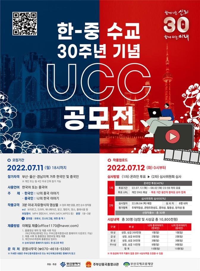 부산시(시장 박형준)는 부산국제교류재단, 주부산중국총영사관과 ‘한-중 수교 30주년 기념 UCC 공모전’을 열고 한-중 간 민간 교류 활성화와 우호 증진에 나선다고 밝혔다.