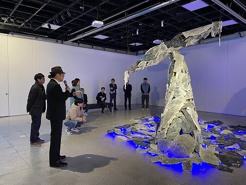 먼저, 강석범 교감은 <소망-잃어버린 꿈을 찾아서>라는 조각 작품으로 나무로 고래 뼈대를 만들고 LED를 설치해 조명과 함께 반짝이는 고래의 형상을 통해 일상에서 잃어버린 자신의 소중한 꿈을 찾고, 설치되어 있는 조명을 통해 신비롭고 몽환적인 전시 공간을 구성하고 있다.