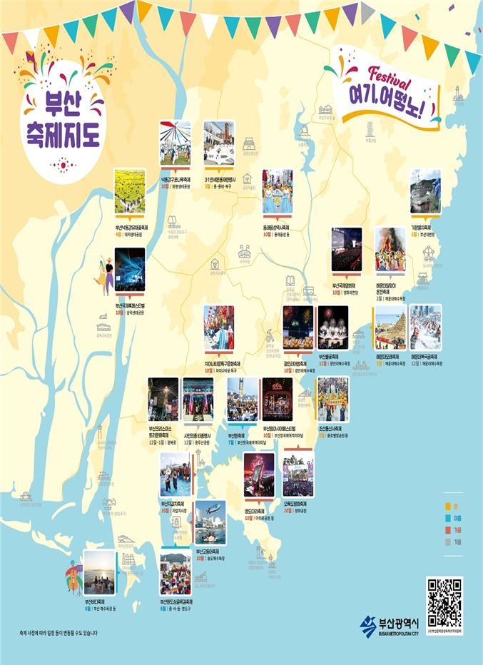 부산시(시장 박형준)는 사계절 내내 특색 있는 부산의 대표 축제를 한 장의 지도로 제작·소개하여 국내·외 관광객 유치에 나선다고 밝혔다.