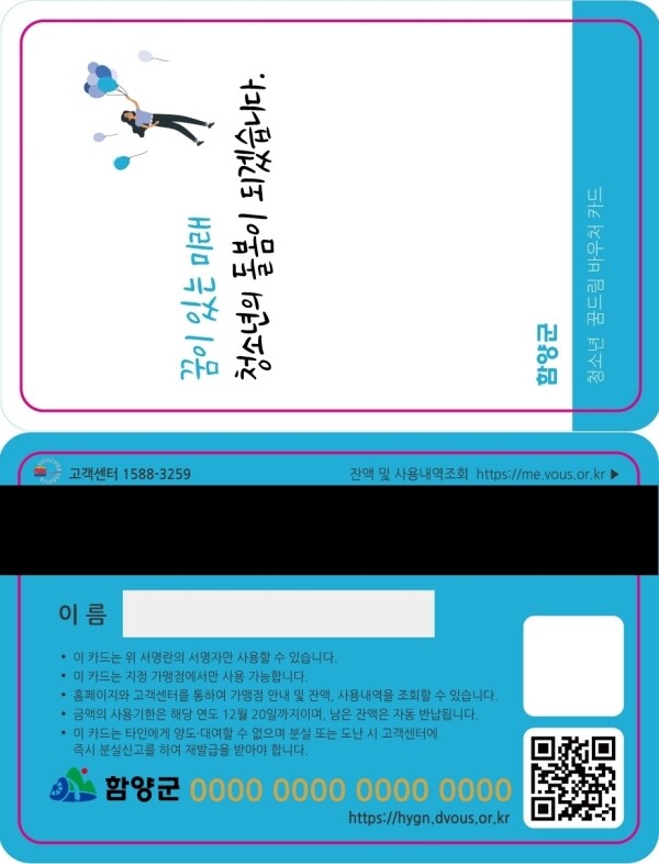 진병영 함양군수는 “민선8기 공약인 청소년 꿈드림 바우처지원사업을 계획대로 시행할 수 있게 돼 기쁘다”며 “청소년 문화·취미활동 지원, 학부모 양육 부담 경감과 더불어 지역경제 활성화에도 도움이 될 것으로 기대한다”고 말했다.