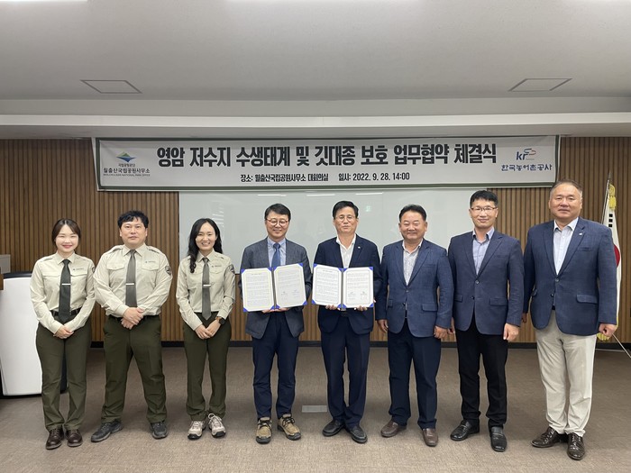 | ▲ 국립공원공단 월출산국립공원사무소(소장 문광선)와 한국농어촌공사 영암지사(지사장 최현수)는 지난 28일 저수지 수생태계 보전과 월출산 깃대종 보호를 위한 업무협약을 체결했다.(출처=월출산 국립공원사무소) |