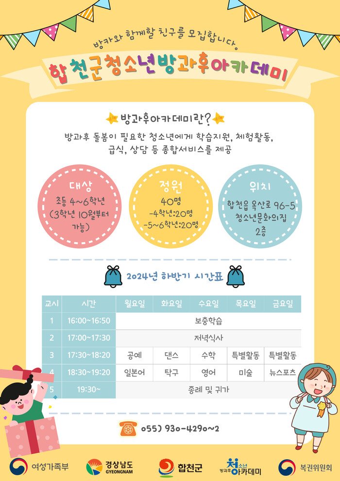 합천군 청소년방과후아카데미의 모집대상은 초등 4학년에서 6학년으로 기초생활수급자, 차상위계층, 한부모·조손·다문화·장애가정·2자녀이상가정, 맞벌이가정과 학교나 지역사회의 추천을 받은 청소년이면 누구나 이용이 가능하다.