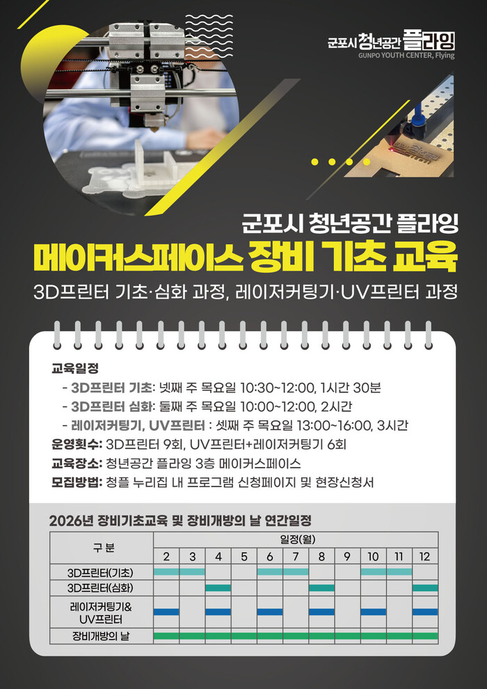 [군포=송윤근 기자] 경기 군포시 청년공간 플라잉(이하, 청플)은 청년들의 제작 역량 강화와 안전한 장비 활용 환경 조성을 위해 장비 기초 안전교육과 장비개방의 날을 2026년 2월부터 12월까지 운영한다고 밝혔다.