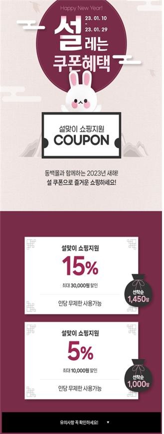 동백전 쿠폰 이벤트의 경우 동백전 온라인쇼핑몰 ‘동백몰’에서 구매 시 사용할 수 있는 15% 할인쿠폰(최대 3만 원 할인)과 5% 할인쿠폰(최대 1만 원 할인)을 인당 사용 제한 없이 선착순으로 제공하며, 해당 쿠폰을 활용하여 다양한 구성과 저렴한 가격대로 제공되는 동백몰 설선물대전 상품군을 할인된 가격으로 구입할 수 있다.