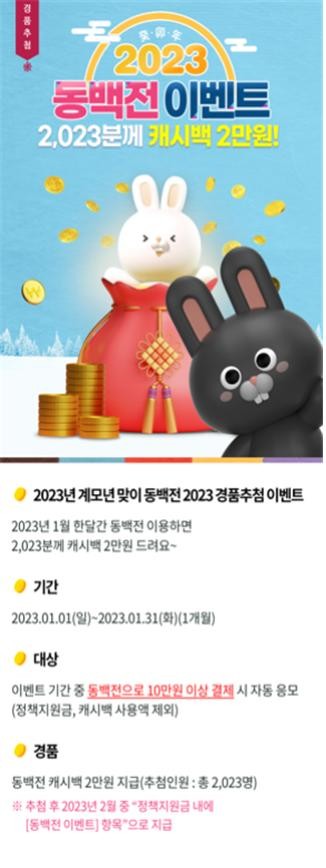 동백전 경품 이벤트의 경우 2023년 계묘년을 맞이하여 추첨을 통해 2,023명에게 동백전 정책지원금 2만 원을 드리며, 1월 한 달간 누구나 동백전 충전금을 10만 원 이상만 사용하면 자동응모 되어 참여할 수 있다.