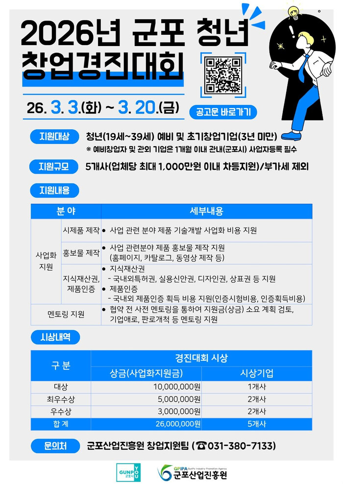 | ▲ 2026년 군포 청년 창업경진대회 지원사업 참가자 모집 안내 포스터 /자료제공=군포시 |