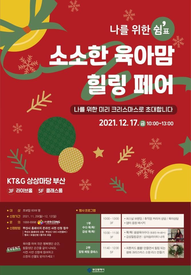 부산시(시장 박형준)는 오는 12월 17일 오전 10시 부산진구 소재 KT&G 상상마당에서 소소한 육아맘 힐링 페어 ‘나를 위한 쉼표’를 개최한다고 밝혔다.