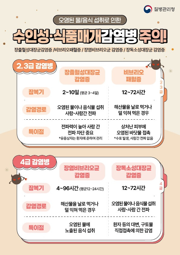 수인성·식품매개 감염병은 세균성 이질, 콜레라, 장티푸스, 장출혈성대장균감염증 등으로 오염된 물이나 덜 익힌 음식 등을 통해 감염될 수 있다.