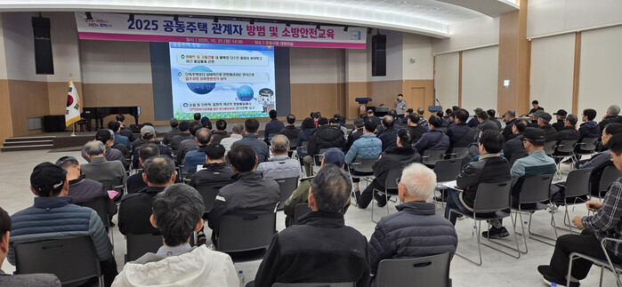 | ▲ 군포시는 10월 27일 군포시청 대회의실에서 공동주택 경비업무 종사자 및 시설물 안전관리자 등 200여명을 대상으로 2025년 공동주택 방범 및 소방안전교육을 진행하고 있다 /사진제공=군포시 |