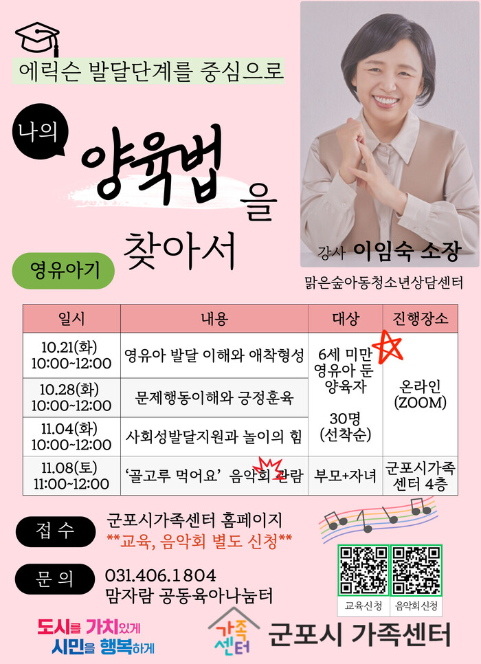 교육 신청 및 공연 예약은 군포시가족센터 홈페이지 또는 전화 문의를 통해 가능하다.