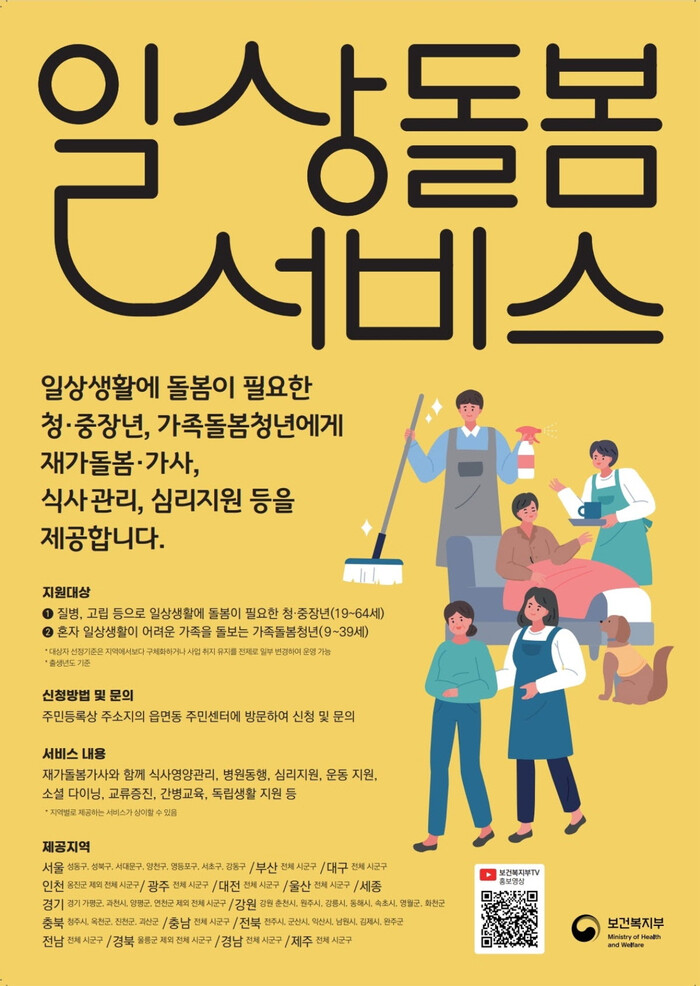 ‘일상돌봄 서비스’는 질병이나 고립 등으로 일상생활에 돌봄이 필요한 청·중장년(19~64세)과 질병·정신질환 등을 앓고 있는 가족을 돌보거나 그로 인해 생계책임을 지고 있는 청년(9~39세)을 지원하기 위해 시행중인 서비스이다.