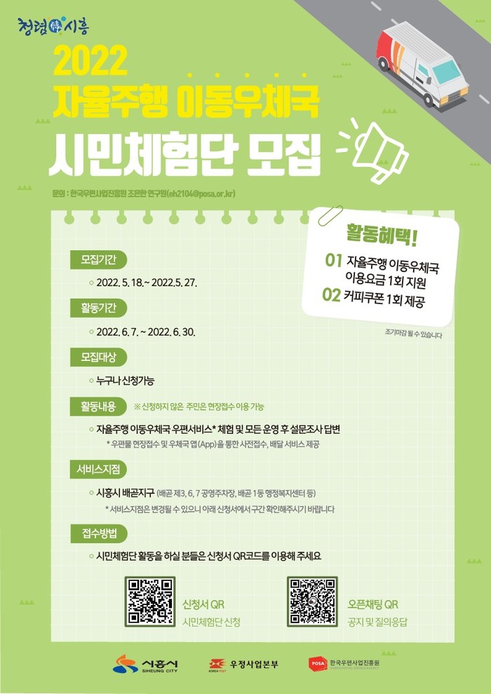 찾아가는 방식의 미래 우편업무 서비스인 「자율주행 이동우체국」은 기업‧연구기관의 혁신기술을 시흥시에 구현 및 실증해볼 수 있도록 지원하는 혁신기술 테스트베드 사업을 통해, 6월 7일부터 30일까지 시흥시 배곧 일대에서 시범 운행에 나설 계획이다.