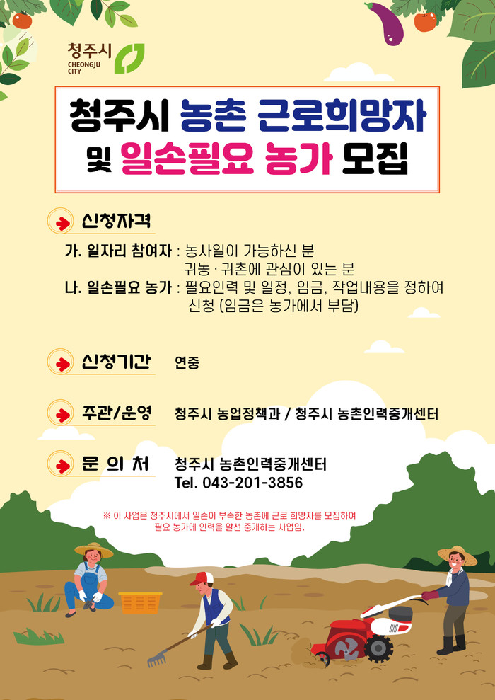 일손이 부족한 농가와 농촌인력 지원을 희망하는 구직자는 청주시 농촌인력중개센터에 전화로 신청하면 임금, 근로조건 등 농가와 구직자간 상호협의를 통해 중개·알선한다.