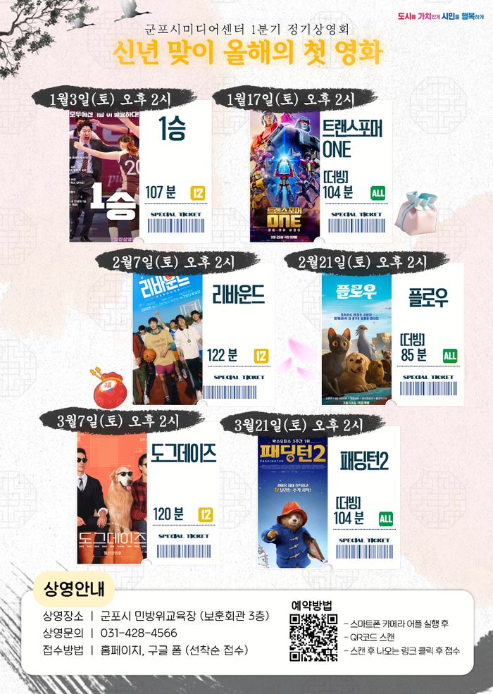 상영은 보훈회관 3층 민방위 교육장에서 진행되며 관람료는 전액 무료이다. 참여 신청은 군포시미디어센터 홈페이지, 구글폼, 또는 현장 방문을 통해 가능해 시민 누구나 부담 없이 참여할 수 있다.