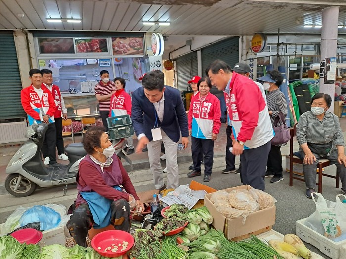 5월 23일 오후2시 합천왕후시장에서 열린 국민의힘 합동 유세에 김윤철 국민의힘 군수 후보와 도의원 군의원을 지원하기 위해 김태호 국회의원이 지원 유세에 나섰다.
