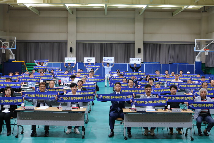 이후, 참석자들은 ‘제104회 전국체육대회 성공개최’ 기념타월을 들며 전국체전 성공개최와 상위입상을 위한 결의를 다졌다.