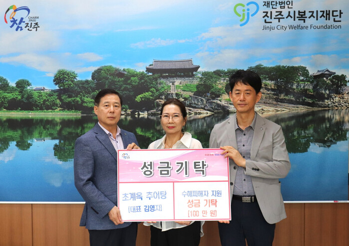 진주시 상대동에 위치한 초계옥 추어탕 김영자 대표는 지난 7일 진주지역 수해 피해 주민들을 돕기 위해 성금 100만 원을 진주시복지재단(이사장 이성갑)에 기탁했다.