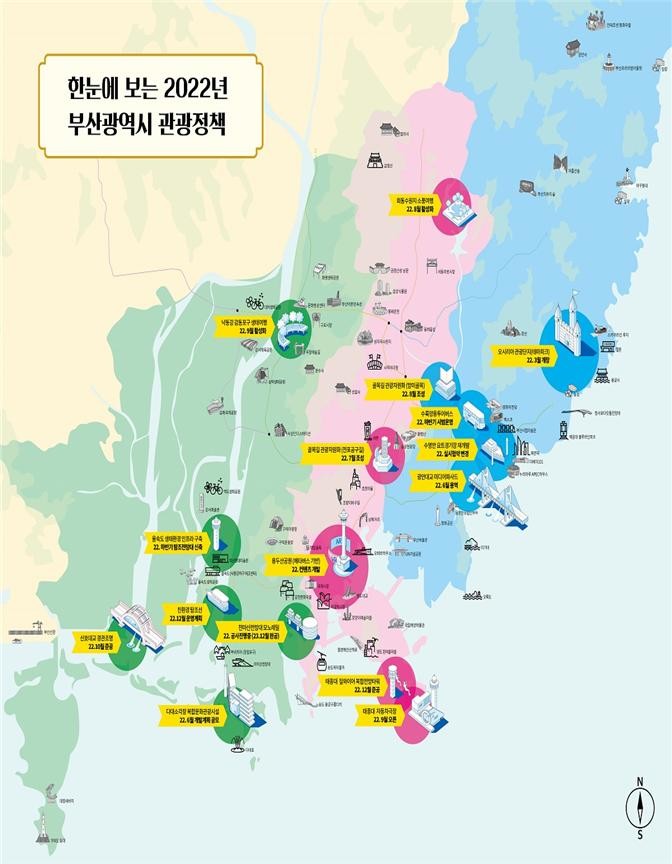 시는 그 첫 번째 이야기로, 올해 새롭게 추진하거나 완료를 앞둔 주요 정책을 지도로 나타내 2022년 달라지는 부산관광을 한눈에 볼 수 있도록 했다. 지도를 통해 동부산권, 고도심권, 서부산권을 구분하여 기존의 관광자원을 바탕으로 주요 관광자원화 사업 진행상황을 입체감 있게 구현했다.