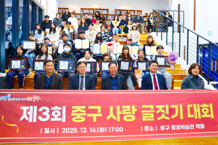 | ‘제3회 중구 사랑 글짓기 대회 시상식’ 참석자들이 포즈를 취하고 있다. [사진=중구의회] |