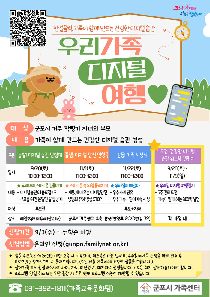 [군포=송윤근 기자] 경기 군포시가족센터(센터장 박성희)는 자녀의 스마트폰 사용 습관 형성이 필요한 가족을 대상으로 ‘우리 가족 디지털 여행’프로그램을 오는 9월 20일(토)부터 11월 22일(토)까지 총 4회에 걸쳐 운영한다고 밝혔다.