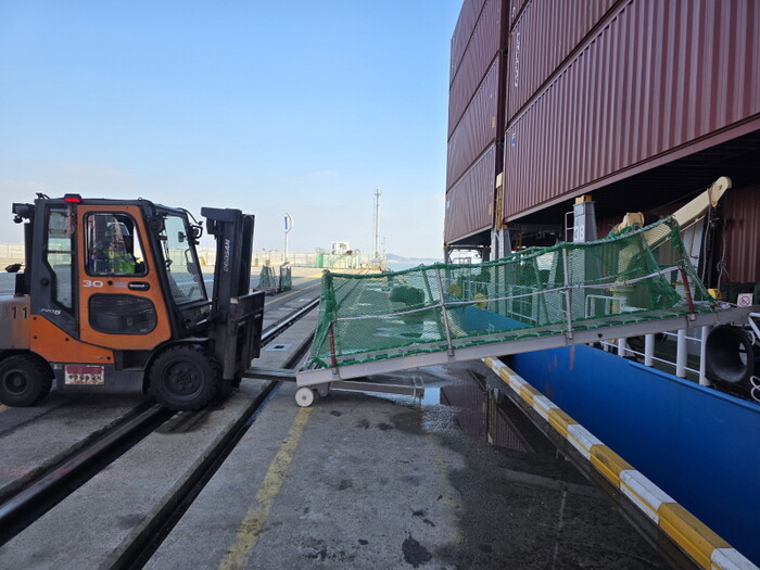 | ▲ 인천 신항 선광신컨테이너터미널에서 힌지식 포크슬롯을 활용, 개발한 승하선 이동용 사다리를 설치하고 있다. (사진=인천항만공사 제공) |
