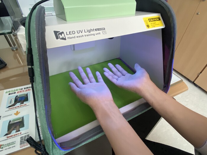 올바른 손씻기 체험을 위한 기구인 뷰박스는 체험자가 손에 형광 로션을 바르고 손을 씻기 전·후를 직접 눈으로 확인하고 비교할 수 있다.