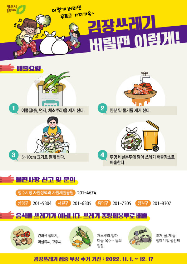 시 관계자는 “김장쓰레기 무상수거 안내문 2만 부를 제작해 읍‧면‧동 행정복지센터로 배부하고, ‘버릴시간’ 애플리케이션에 공지했다”며, “많은 시민들이 온·오프라인 안내문을 참고해 배출해 줄 것을 당부드린다”고 말했다.