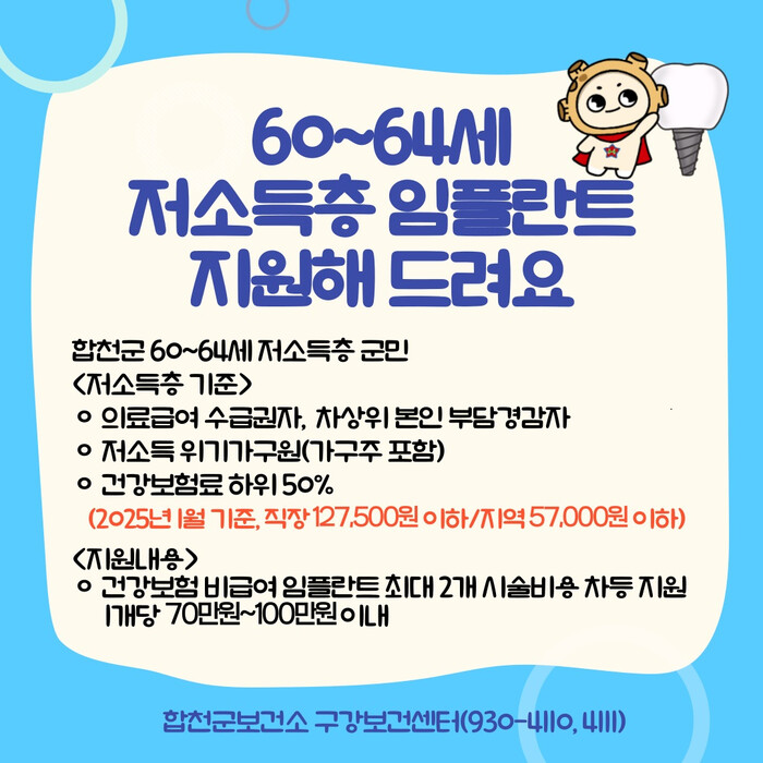 또한, 합천군은 2023년부터 2024년까지 60~64세 저소득층 임플란트 지원사업을 통해 48명에게 91개의 임플란트 비용을 일부 지원하였고, 현재 10명이 임플란트 진료를 진행 중이다.