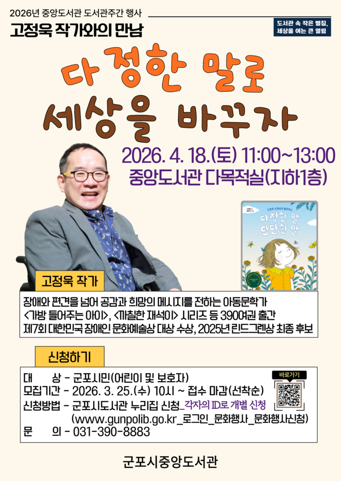 행사 관련 사항은 군포시도서관 누리집 공지사항에서 확인할 수 있으며, 참여 신청은 3월 25일(수)부터 선착순으로 접수한다.