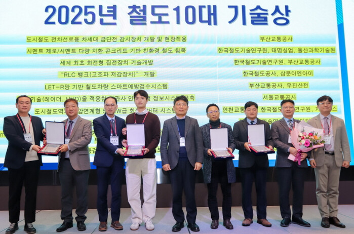 | ‘2025년 철도 10대 기술상’ 수상자들이 기념촬영을 하고 있다. (왼쪽에서 7번째 인천교통공사 오태윤 시스템관리처장, 오재함 전기팀장) |