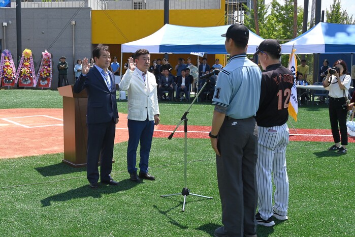 전년도 우승팀인 클리퍼스 야구단의 우승기 반환, 선수대표 선서, 김천시야구소프트볼협회의 복지 성금 200만 원 전달식과 개장을 기념하는 테이프 커팅과 내빈들의 시구가 이어졌다. 행사 후에는 주요 내빈들이 경기를 관람하며, 복합운동장으로 이동해 시설을 견학했다.