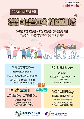 부산시교육청은 ▲김치 나눔 Day ▲김치 소통 Day ▲가족 김치 체험 Day ▲가족 영양체험 Day ▲유아 영양체험 Day 등 5개 프로그램으로 행사를 운영한다.
