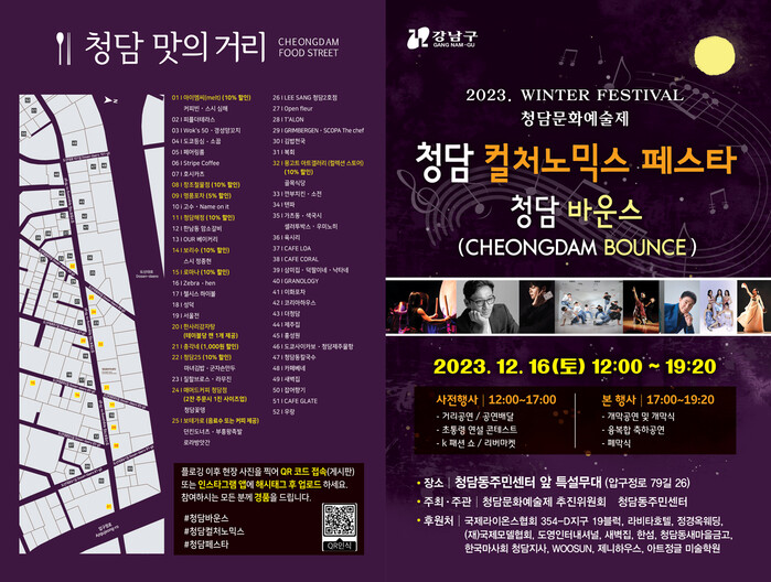 아울러 상권 활성화를 위해 청담동 맛의 거리 지도를 제작했다. 행사 당일 12개 음식점, 카페 등이 가격 할인 행사에 동참한다. 리버마켓 상인들도 함께해 개성 넘치는 플리마켓을 차린다.