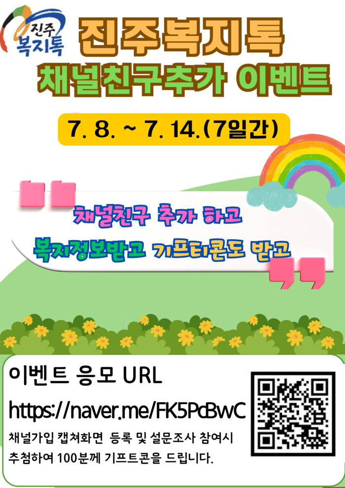 이벤트 기간은 7월 8일부터 14일까지 7일간이며, 이벤트 참여자 중 100명을 무작위로 추첨해 1만원 상당의 기프티콘을 증정할 계획이다. 당첨자 발표는 7월 17일 진주복지톡과 시청 홈페이지 게시와 함께 개별로 안내될 예정이다.