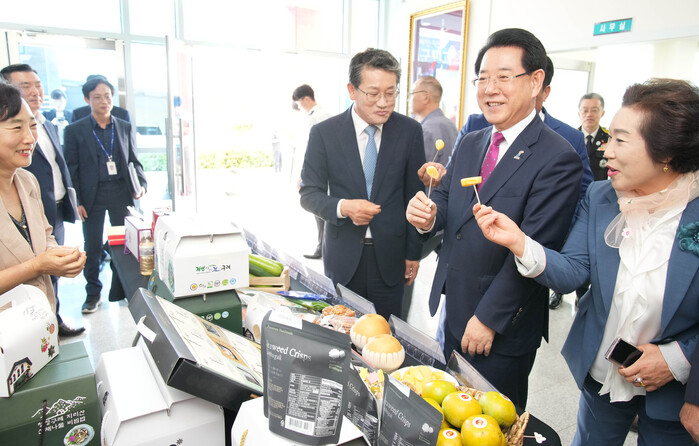 | ▲ 김영록 전남도지사가 구례군 도민과의 대화에 앞서 대회장 입구에 마련된 구례 특산품을 살펴보고있다.(출처=전남도) |