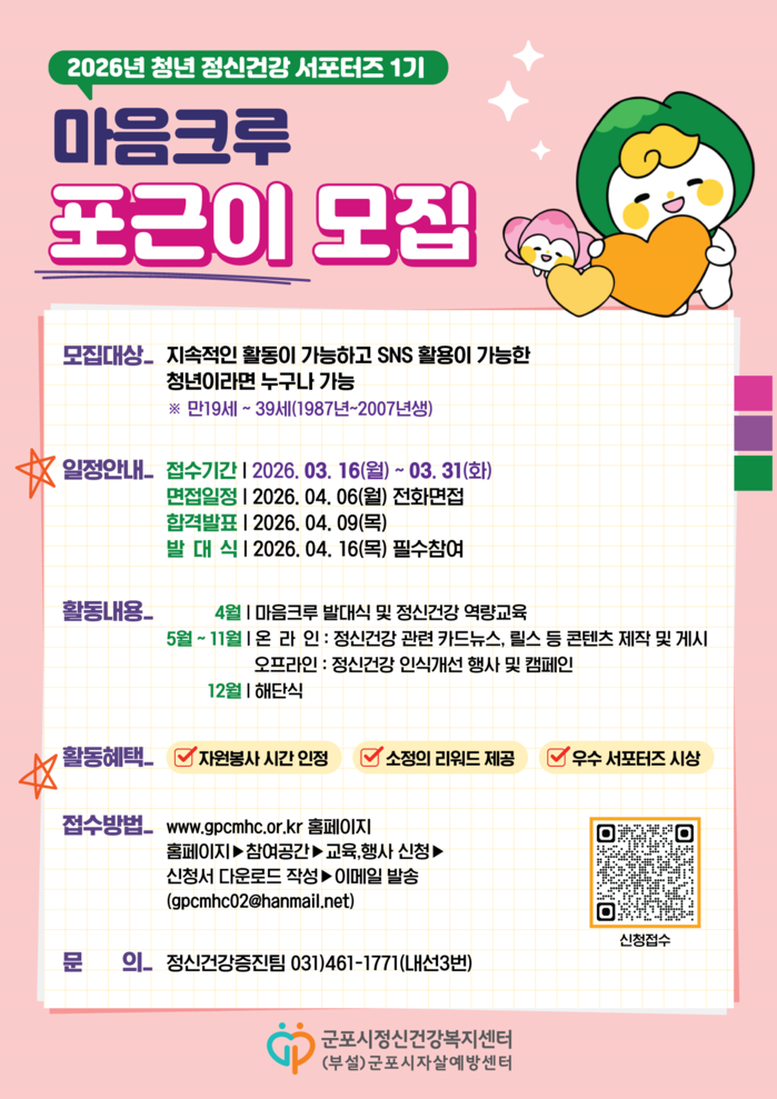 군포시정신건강복지센터 관계자는 “정신건강에 관심을 가지고 지역사회에 따뜻한 변화를 만들어갈 역량 있는 분들의 많은 참여를 바란다”고 전했다.