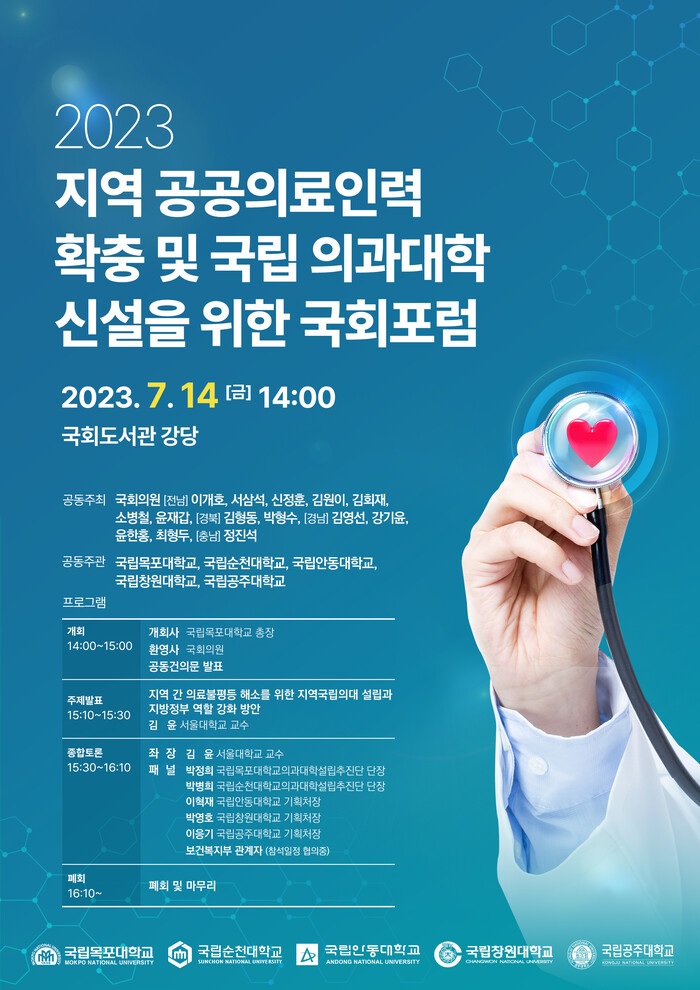 [무안=황승순 기자]국립목포대학교(총장 송하철), 국립순천대학교(총장 이병운), 국립안동대학교(총장 정태주), 국립창원대학교(총장 이호영), 국립공주대학교(총장 임경호)가 공동주관하고 해당 지역 국회의원 14명이 공동 주최하는 ‘지역 공공의료인력 확충 및 국립 의과대학 신설 촉구 국회포럼’이 7월 14일 국회도서관 강당에서 개최된다.