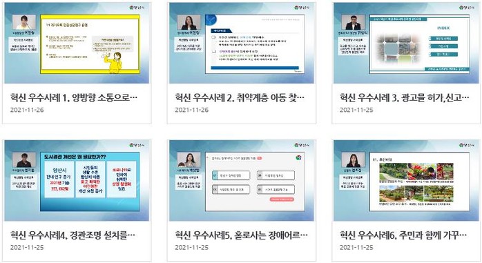 양산시는 공무원의 혁신적, 적극적 업무 처리에 대한 합리적 평가를 통한 보상 제공으로 혁신 및 적극행정 동기 부여 및 문화 확산을 위해 2021년 하반기 혁신 및 적극행정 우수사례 경진대회를 개최하여 혁신 우수사례 6건, 적극행정 우수사례 6건을 각각 선정했다.