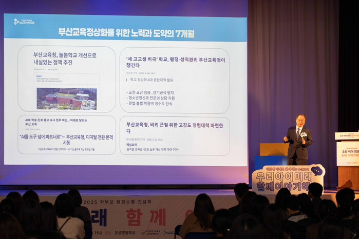 간담회는 교육감이 직접 학부모를 만나 교육 정책 방향을 설명하고, 학부모 의견을 현장에서 청취하는 상호 소통형 행사다. 지난달 28일 해운대 좌동초를 시작으로, 온샘초(18일), 가야초(21일), 용수초(26일)에서 잇따라 진행된 간담회에는 지금까지 600여 명의 학부모가 참석했다.