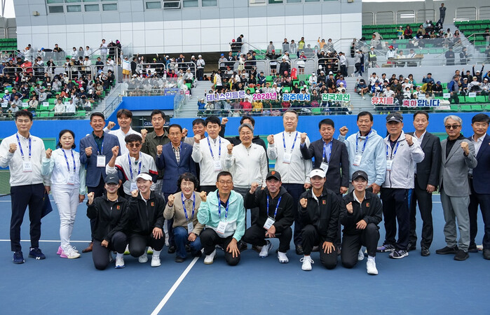 [광주=정찬남 기자] 강기정 광주광역시장(사진 뒷줄 가운데)이 지난 25일 오전 남구 진월테니스장에서 열린 '제21회 광주시장배 생활체육 테니스대회'에 참석해 전갑수 광주시체육회장 등 내빈들과 기념촬영을 하고 있다./광주광역시 제공